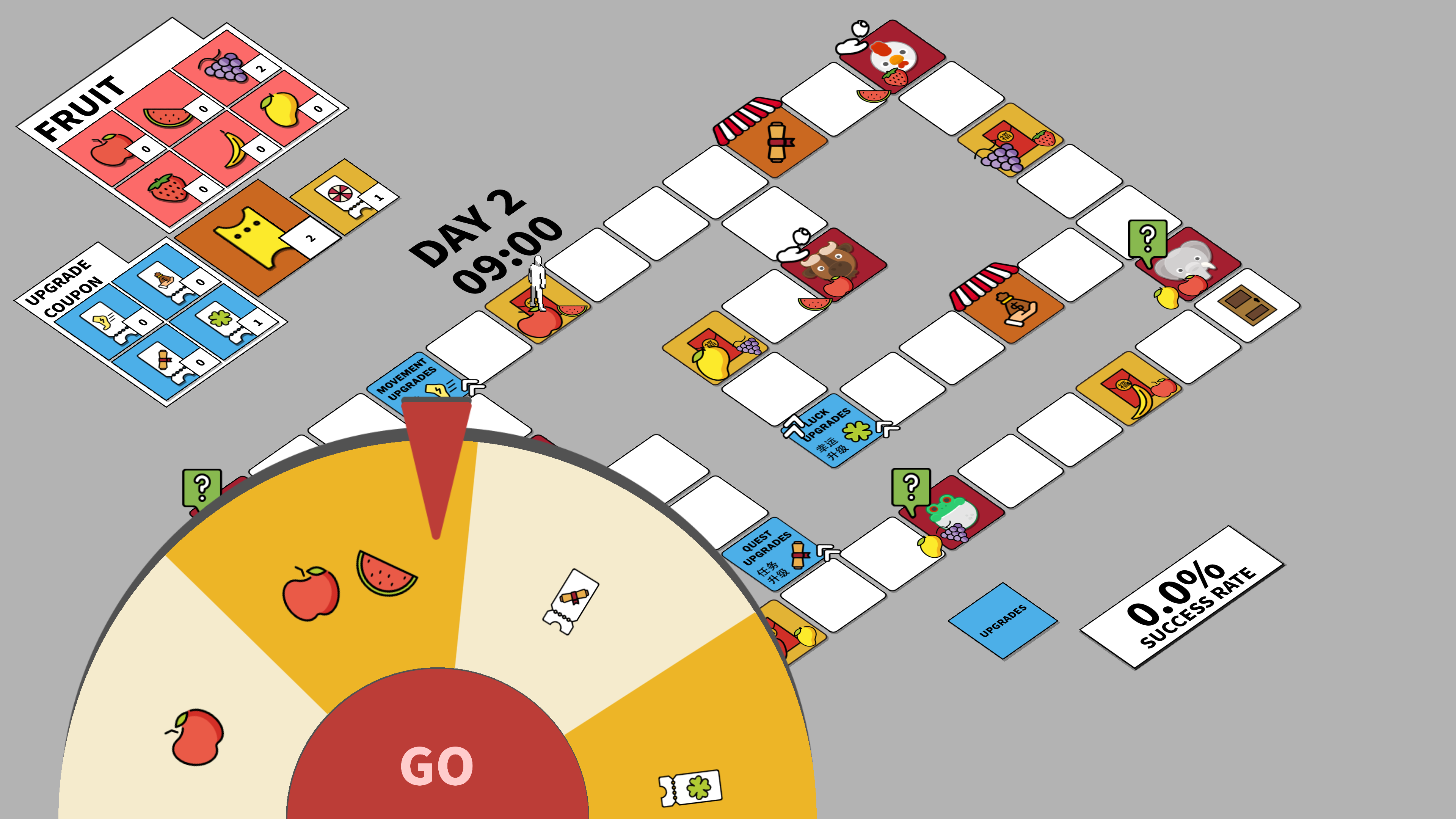 This project features a mix of "Monopoly-style" board traversal and lucky wheel mechanics. Move across the grid, spin for rewards, and strategically upgrade your abilities in this isometric, card-based world.